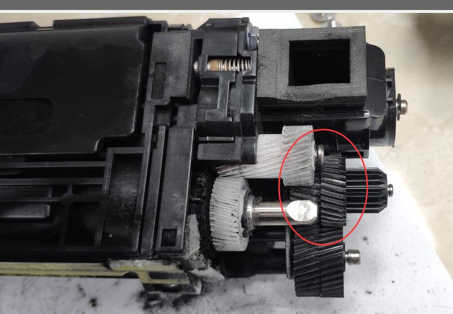 理光MPC3004打印很淡,基本上是空白,打印的时候还会有异响,拆开看黑色的鼓单元,发现图中黑色显影单元上的齿轮磨损了,没法传动白色的齿轮转动.